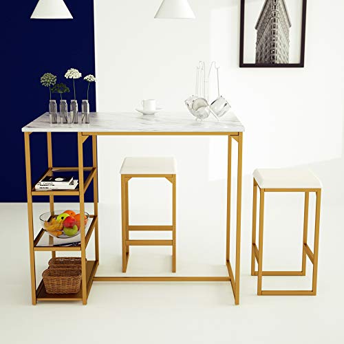 6. SHA CERLIN Modern Dining Kitchen Table Set/Bar Table Set with 2 Compact Bar Stools/Metal Frame, Shelf Storage/Dining Room Table with Faux Marble Top, Gold and White